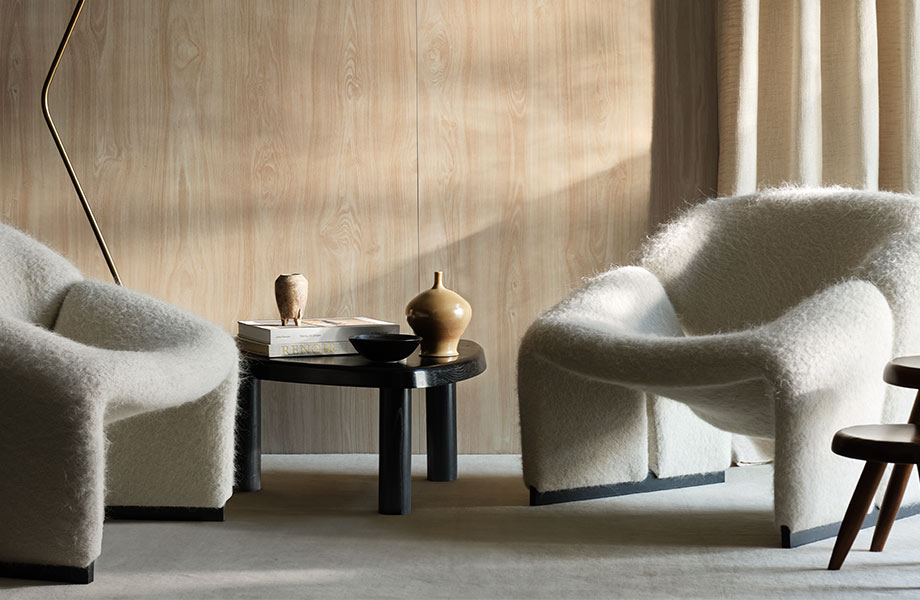 Across these décors, planked Italian walnut composed of sap and heartwood is enhanced with several real wood finishing techniques from luminescent light to natural and sophisticated dark stains.